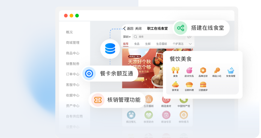 助力企业级餐饮服务商快速构建在线食堂,通过团餐、社餐、外卖、电商百货多元化商品服务资源,解决职工餐卡结余消费痛点